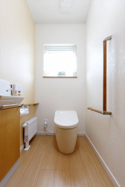 1階のトイレは間口を広くして手すりも設置しました。