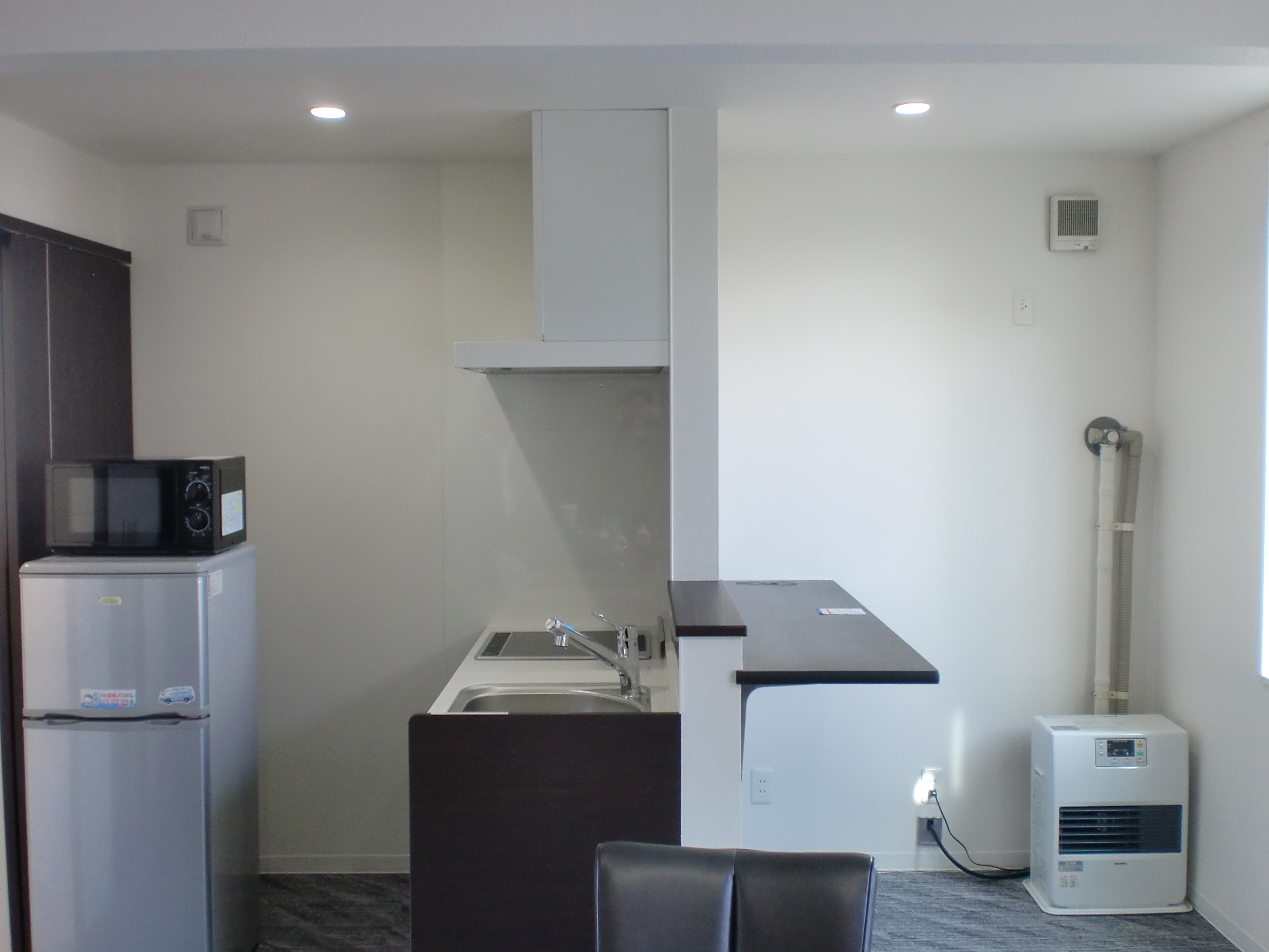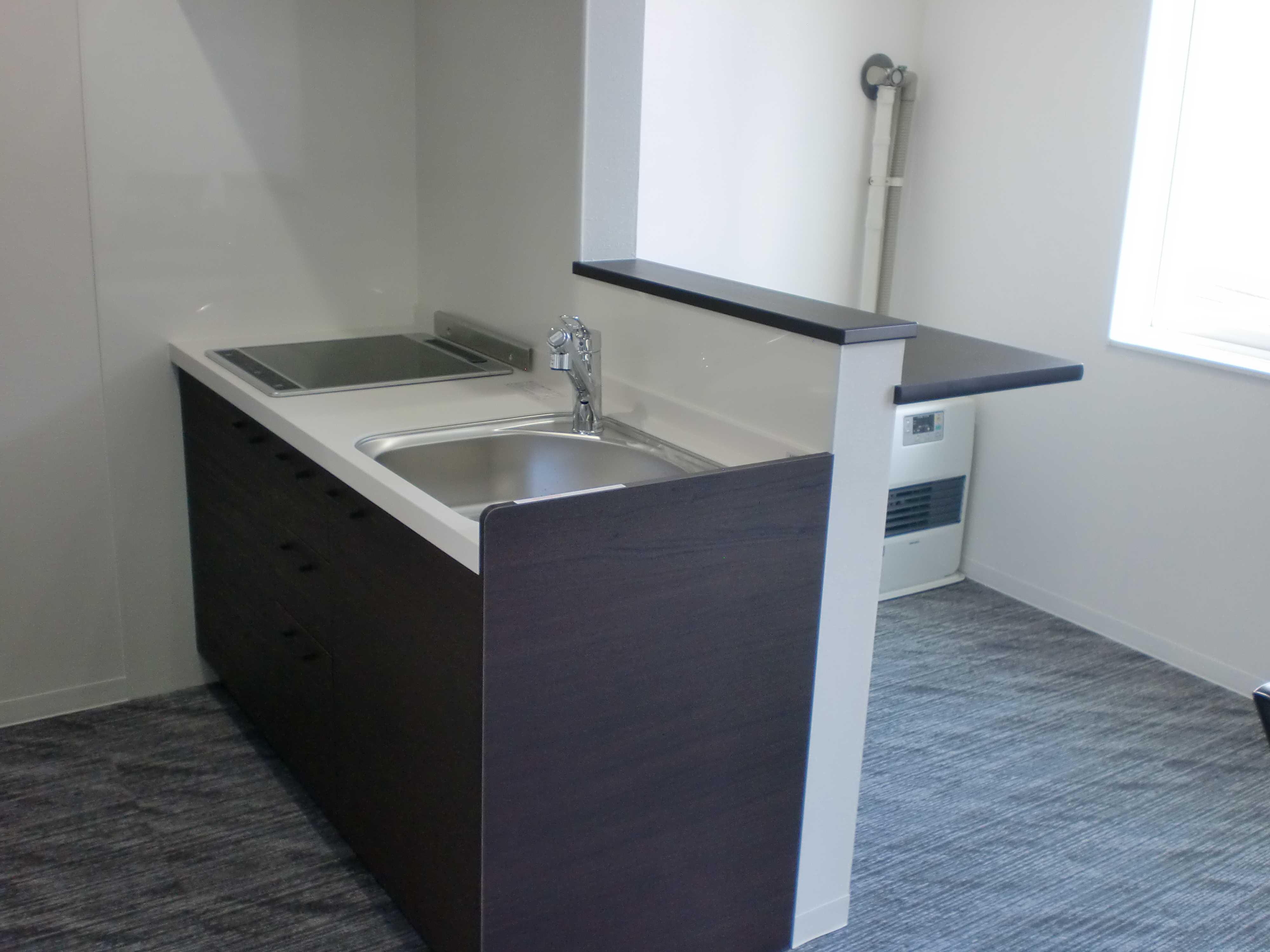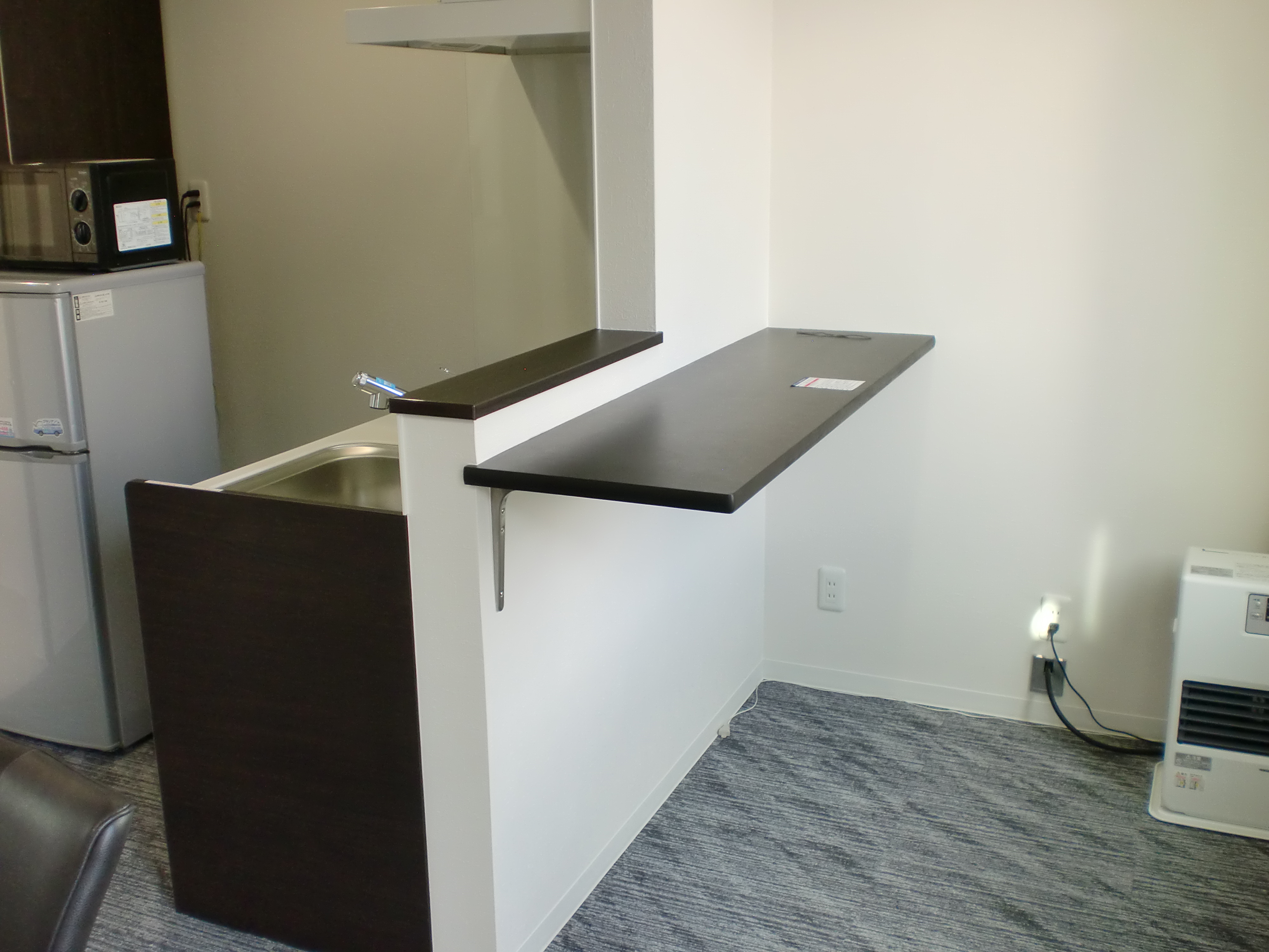 壁付けのキッチンを対面式に変更。向かいにカウンターを付けて簡単な食事をできるようにしました。