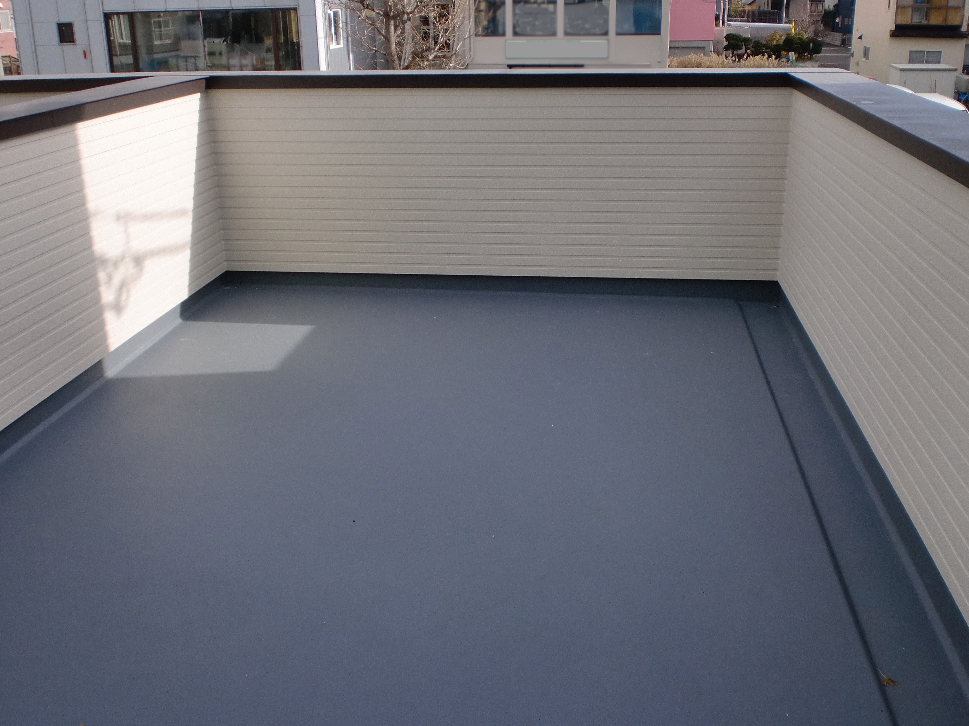 カーポートを車庫にするために屋根を作り、そこをバルコニーとしました。道路側からの目隠しとして手摺壁を高くしています。