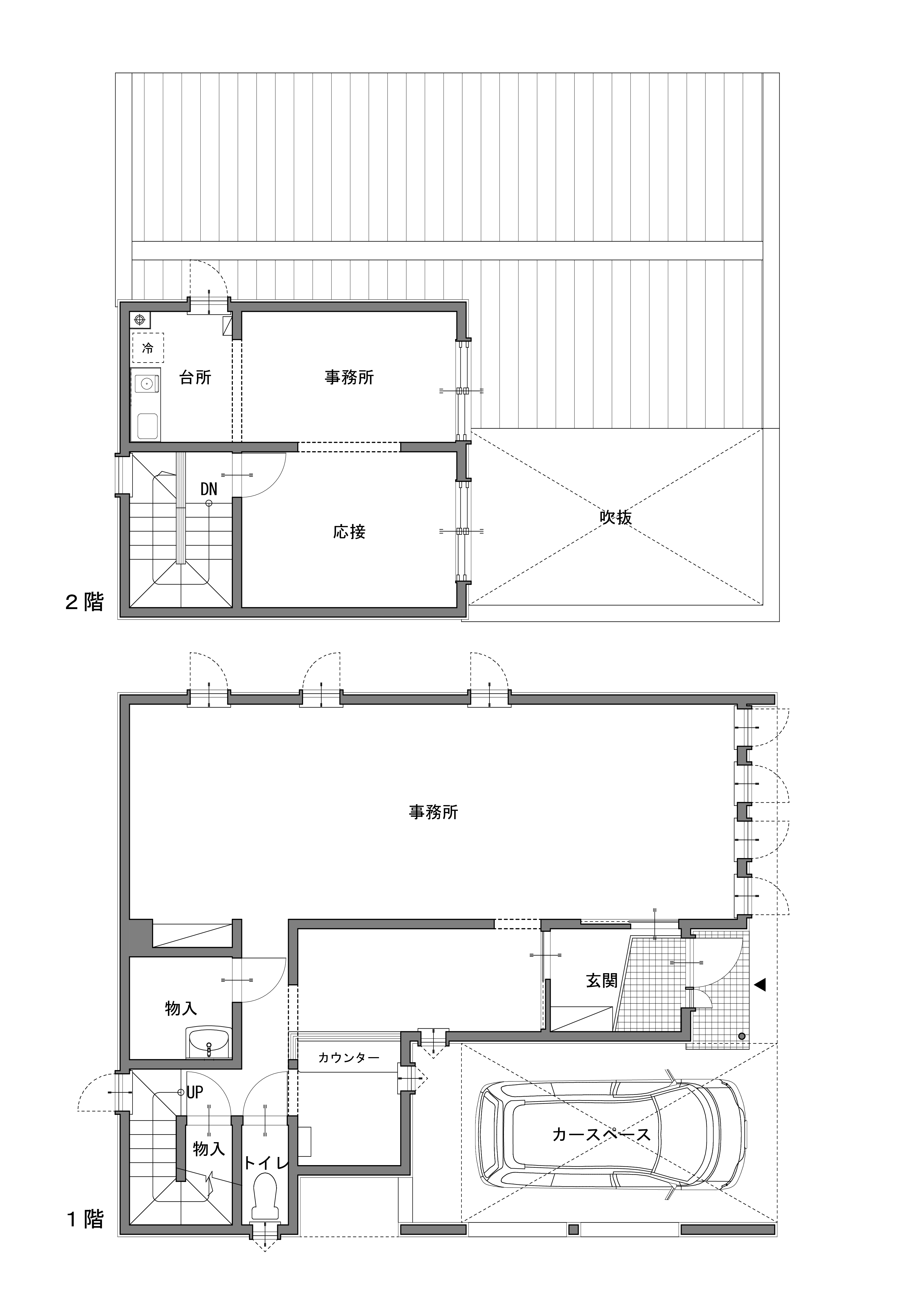 2階:カーポート上の吹抜はバルコニーにして車庫の屋根としました。キッチンは移動して対面式へ。もとの台所の位置にトイレとシャワールームを設置しました。応接と事務所の間の壁を取り払い一体感のある空間へとしています。