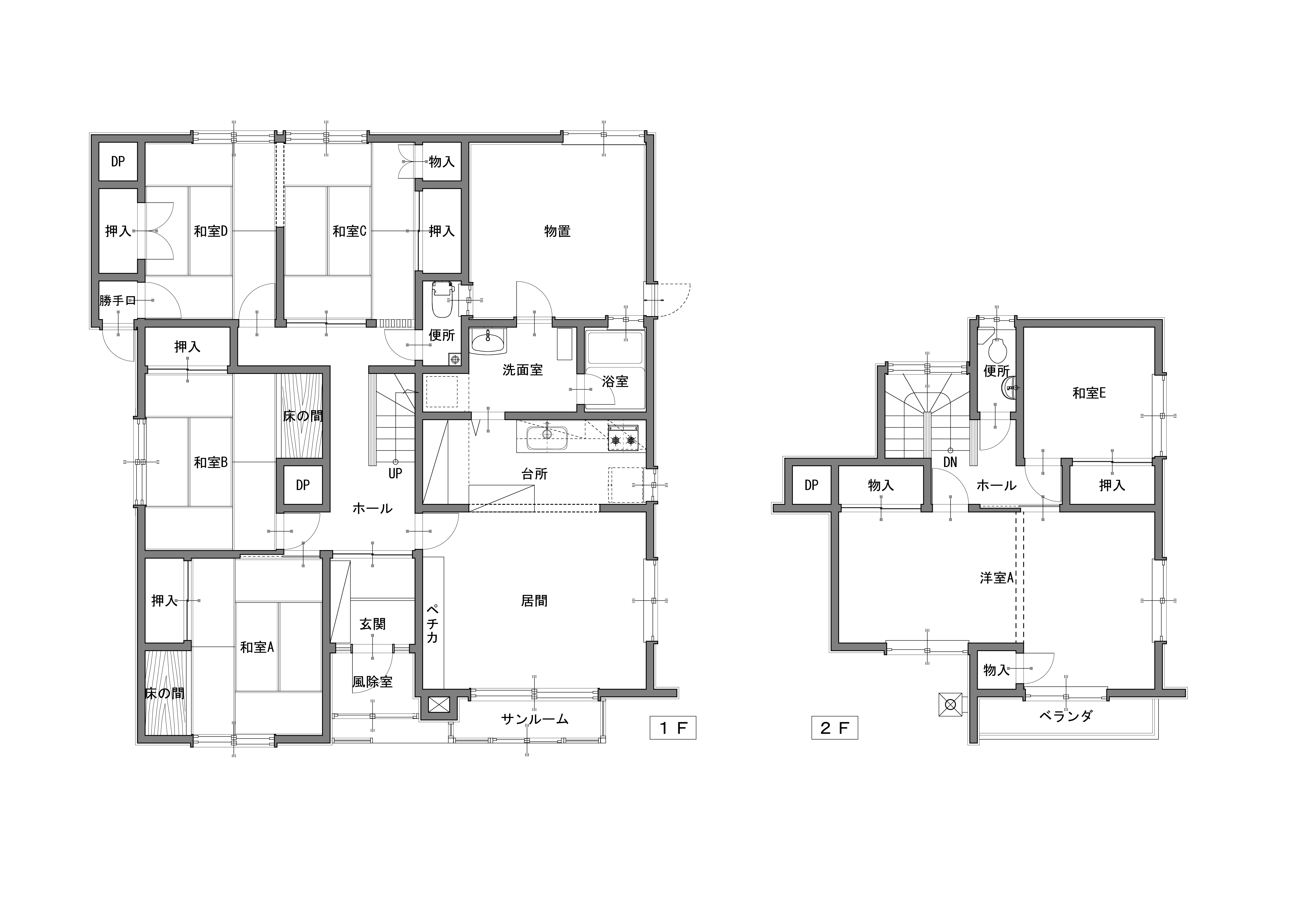 1階:台所が狭かったので対面キッチンに変更。台所~洗面室~ホールと回遊動線を確保。和室4部屋は2つの広い洋室へ。高齢の母親の寝室の隣にトイレを配置しました。