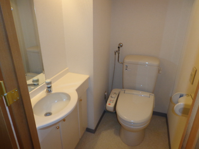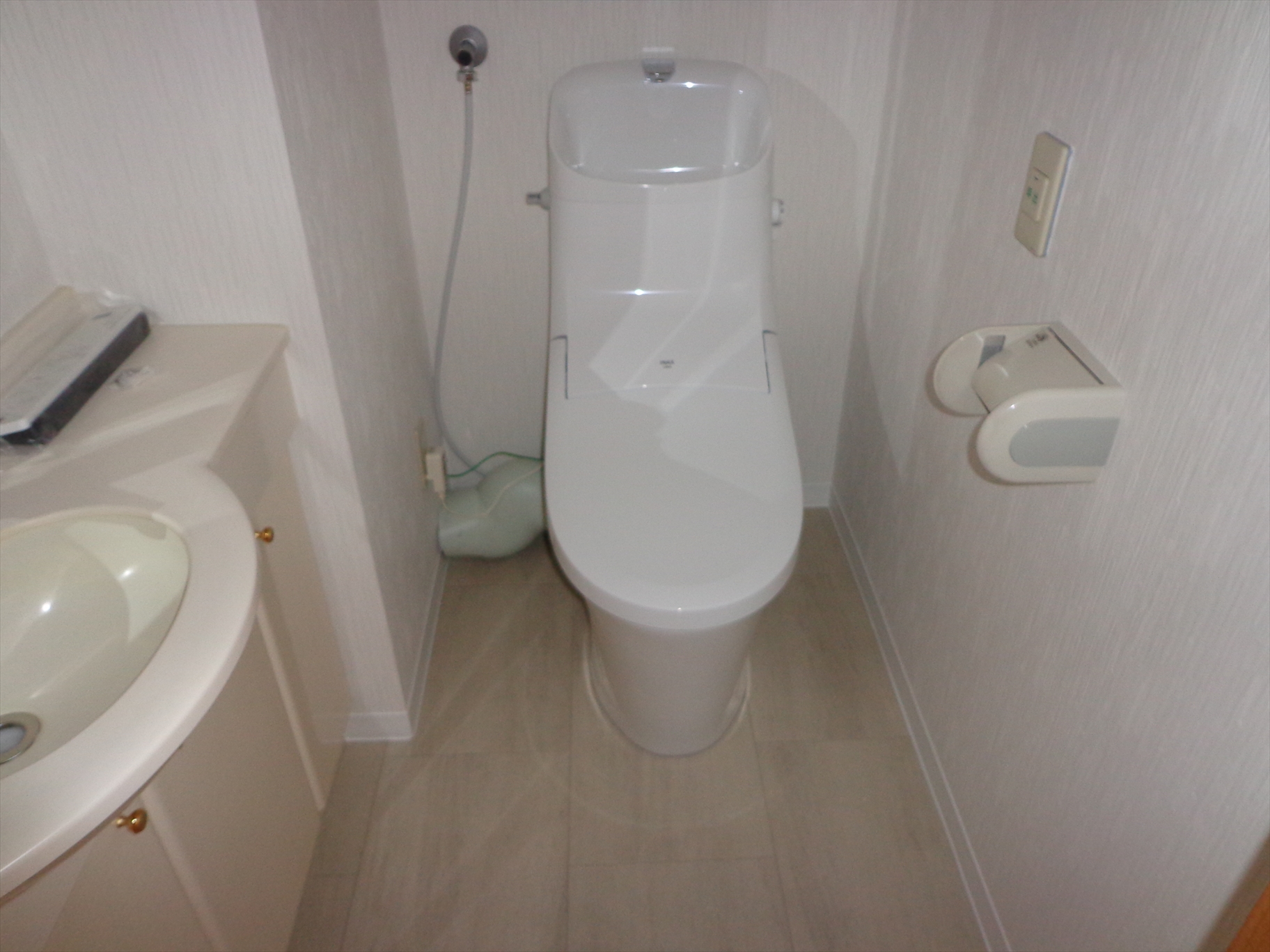 手洗いカウンターはそのまま残し、シャワートイレ一体型の節水トイレに交換しました。天井壁クロスと床クッションフロアーも貼り替えました。