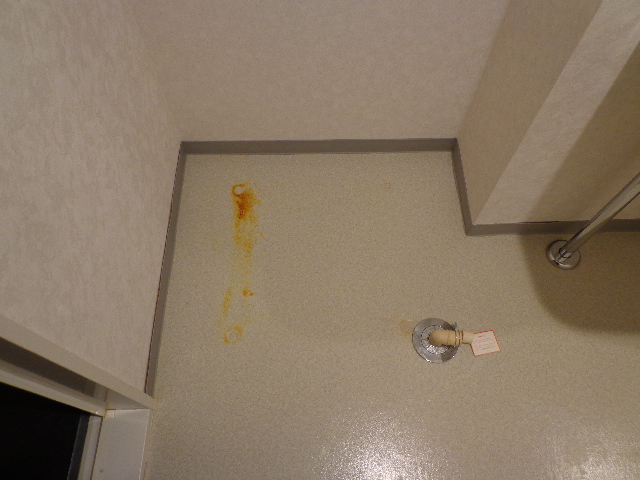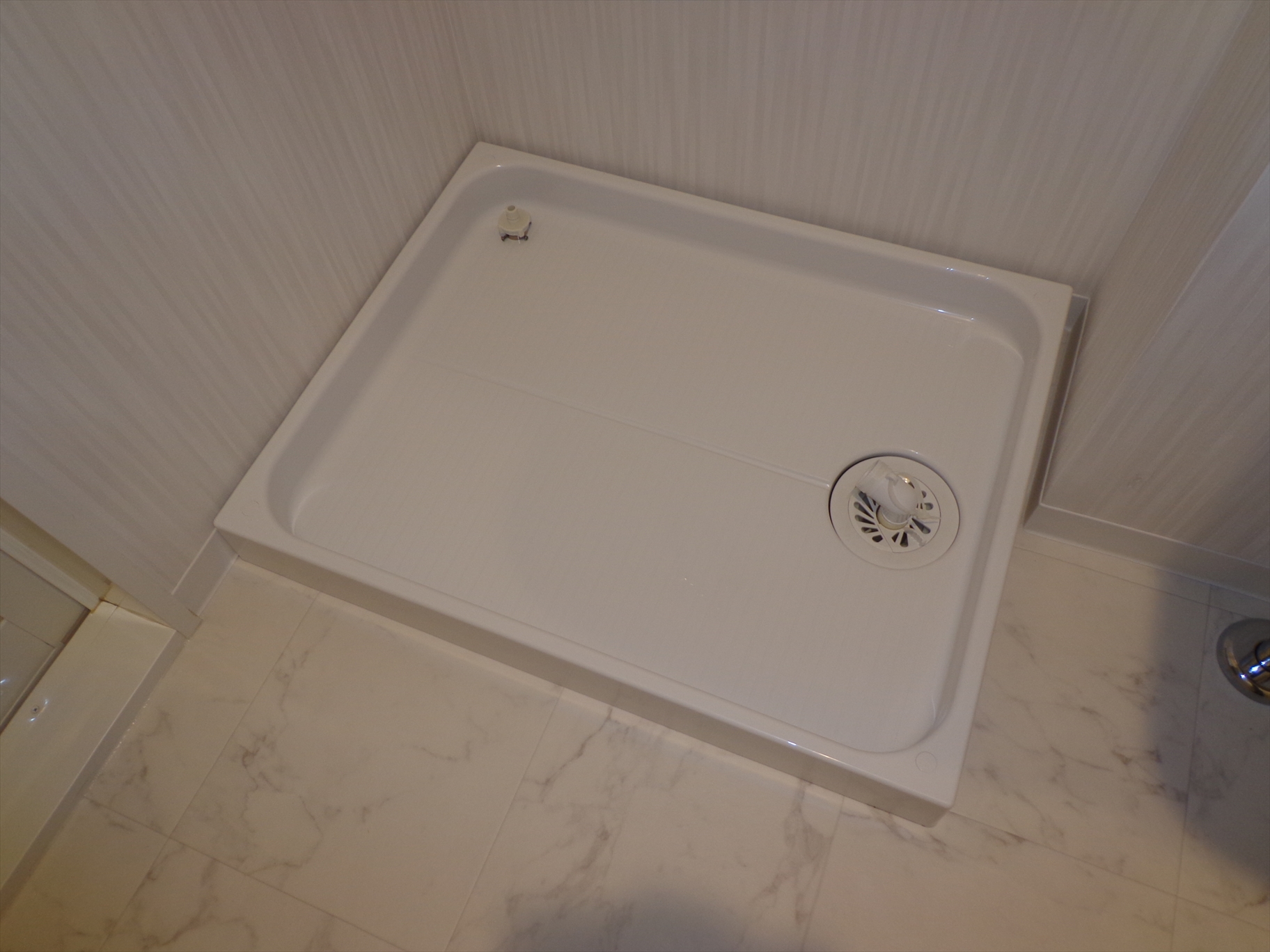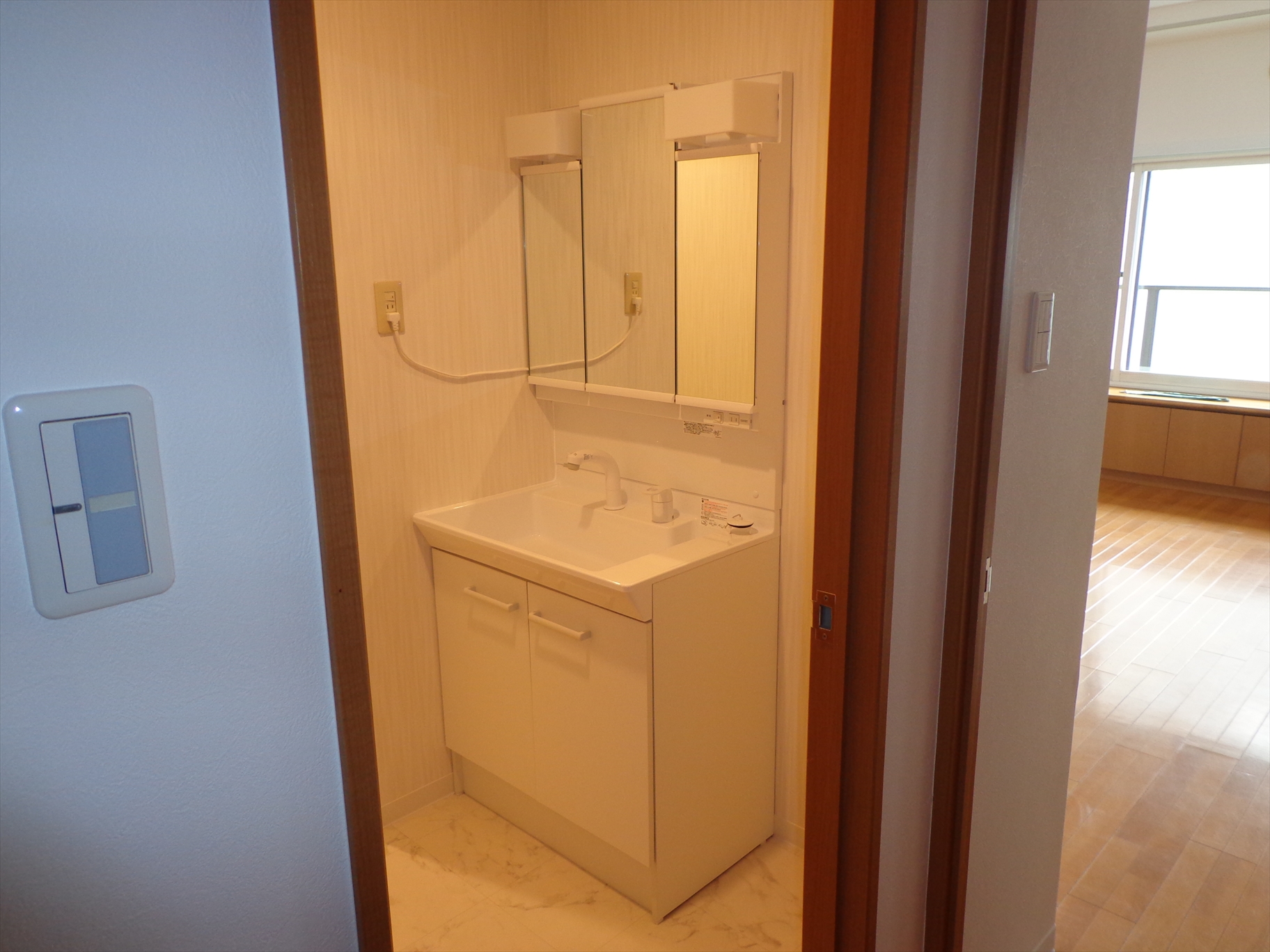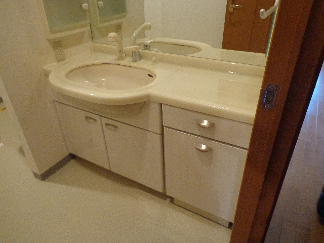 幅広の洗面カウンターから幅750mmで3面鏡の洗面台に交換。洗濯機パンを新設し床のクッションフロアーを張り替えました。