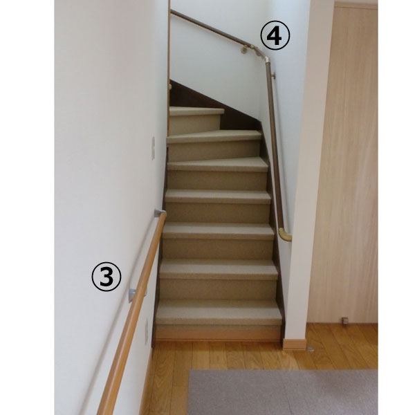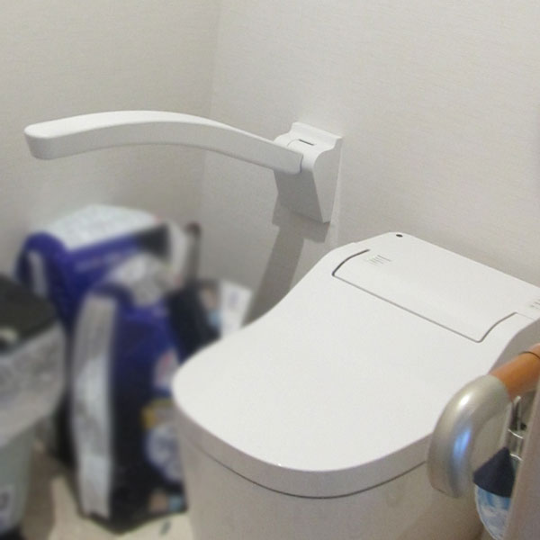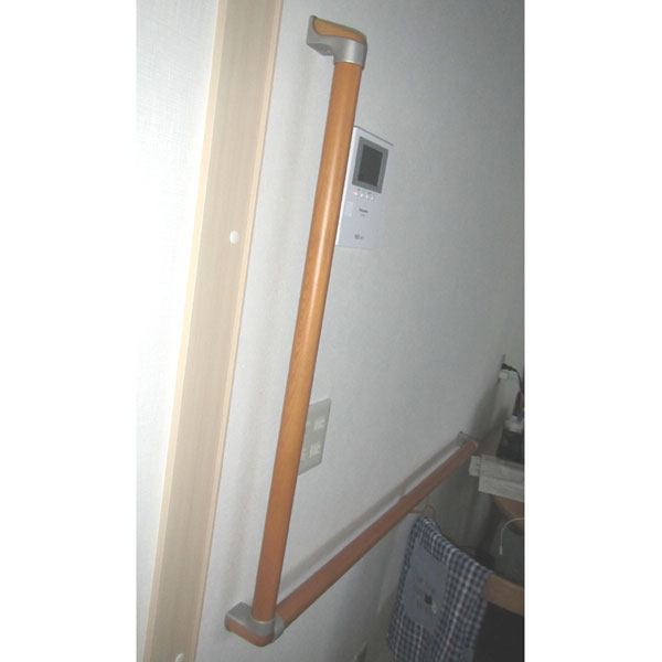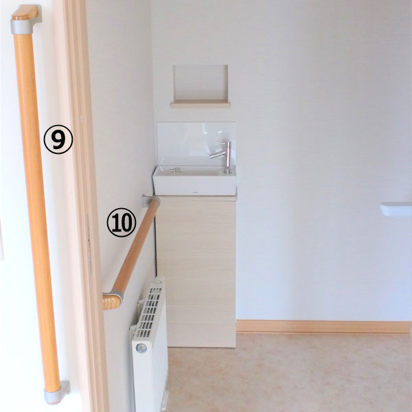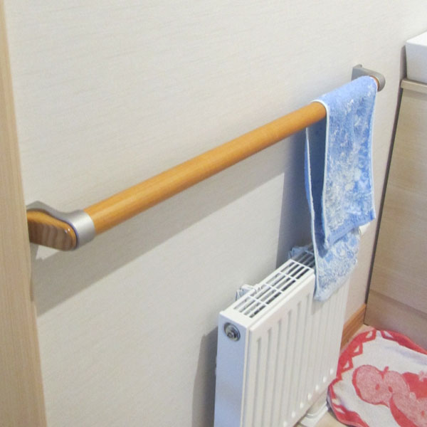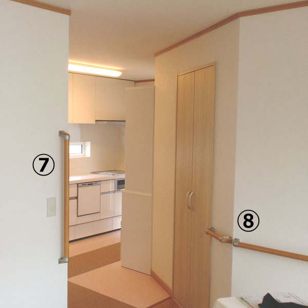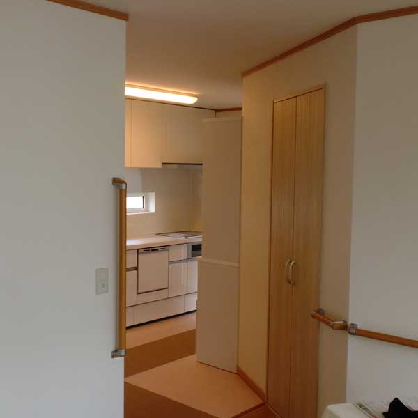 車椅子対応で介護もしやすいように1階を全面バリアフリー改修しました。玄関を入った後は段差無くどの部屋にも行けます。移動しやすいように手すりも随所に設置しました。2室あった和室はどちらも洋室に変更し、そのうち1つの洋室に隣接してトイレを増設。介護しやすいように広めに作り、入口は引戸にして車椅子でも利用しやすいようになっています。洗面台も車椅子対応のものを採用。浴室へも段差なしで行けます。