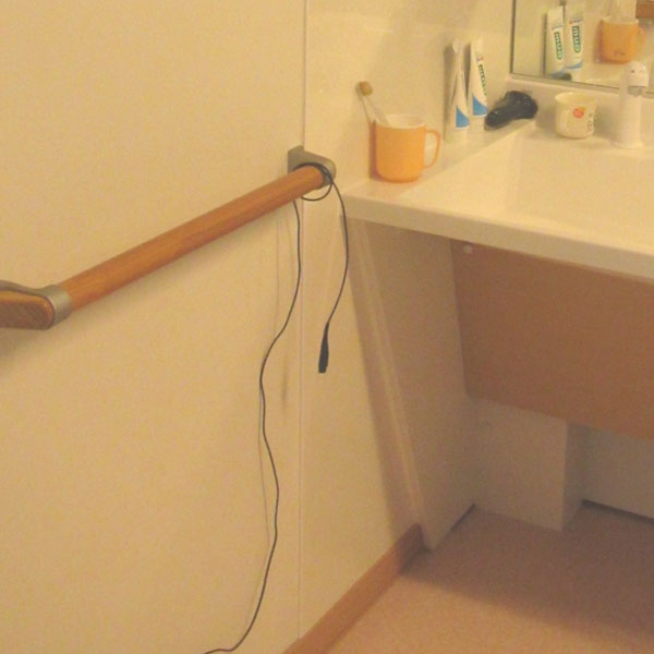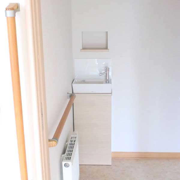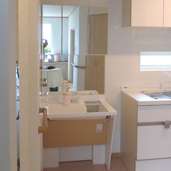 車椅子対応の洗面台に交換し、車椅子で行きやすいようにキッチンの隣に設置しました。