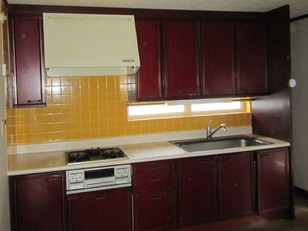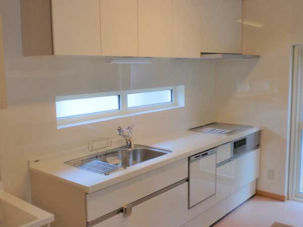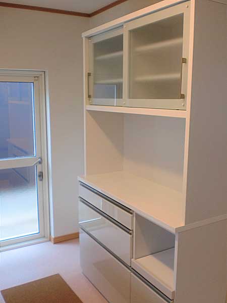 キッチンは元の位置から90cm右に寄せています。加熱機器はガスコンロからIHヒーターに変更、食洗機も新たに組み込みました。食器棚もキッチンに合わせて設置。トイレを増設した分、台所スペースは狭くなっています。