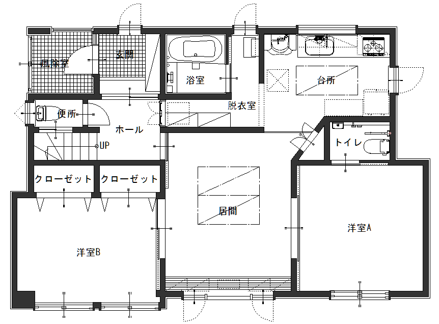 和室2室をどちらも洋室へ変更。そのうち1室に隣接して車椅子対応トイレを増設。その分台所は狭くなりました。車椅子で行きやすいようにキッチンの横に洗面台を設置。浴室は0.75坪から1坪タイプへ大きくしました。ホールから居間への入口をドアから引戸へ変更しました。
