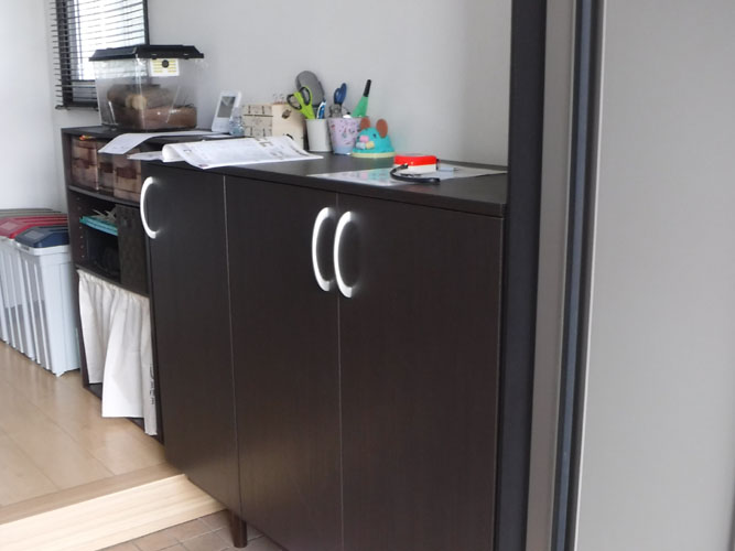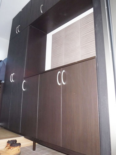 既存の下駄箱を残し、それと同じ商品で収納を増やしました。色を合わせたので一体感のある仕上がりとなりました。