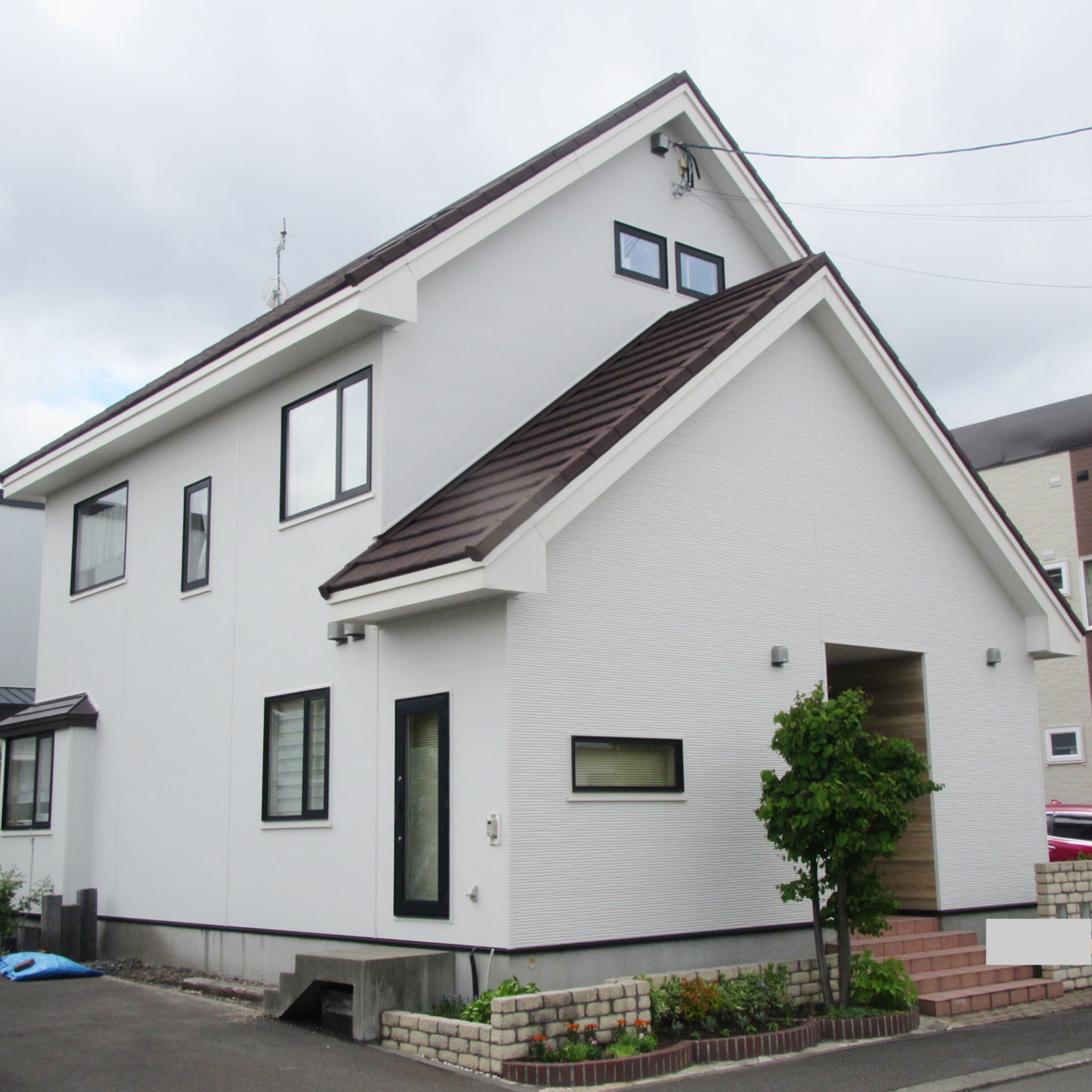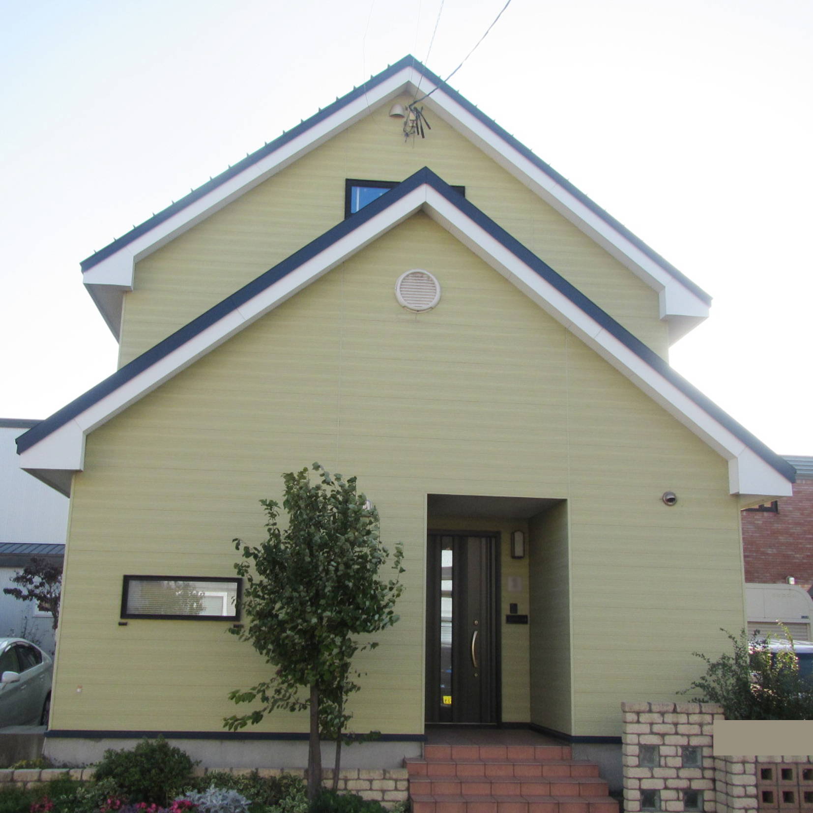 全体:〈アイジー工業〉NF-マイルドウェーブ(F-ホワイト)、1階道路側一面:NFT-モンターニュ(FT-シェルホワイト)、玄関部:〈旭トステムDANサイディング〉プレシャスウッドSF(SWプレシャスベージュ)