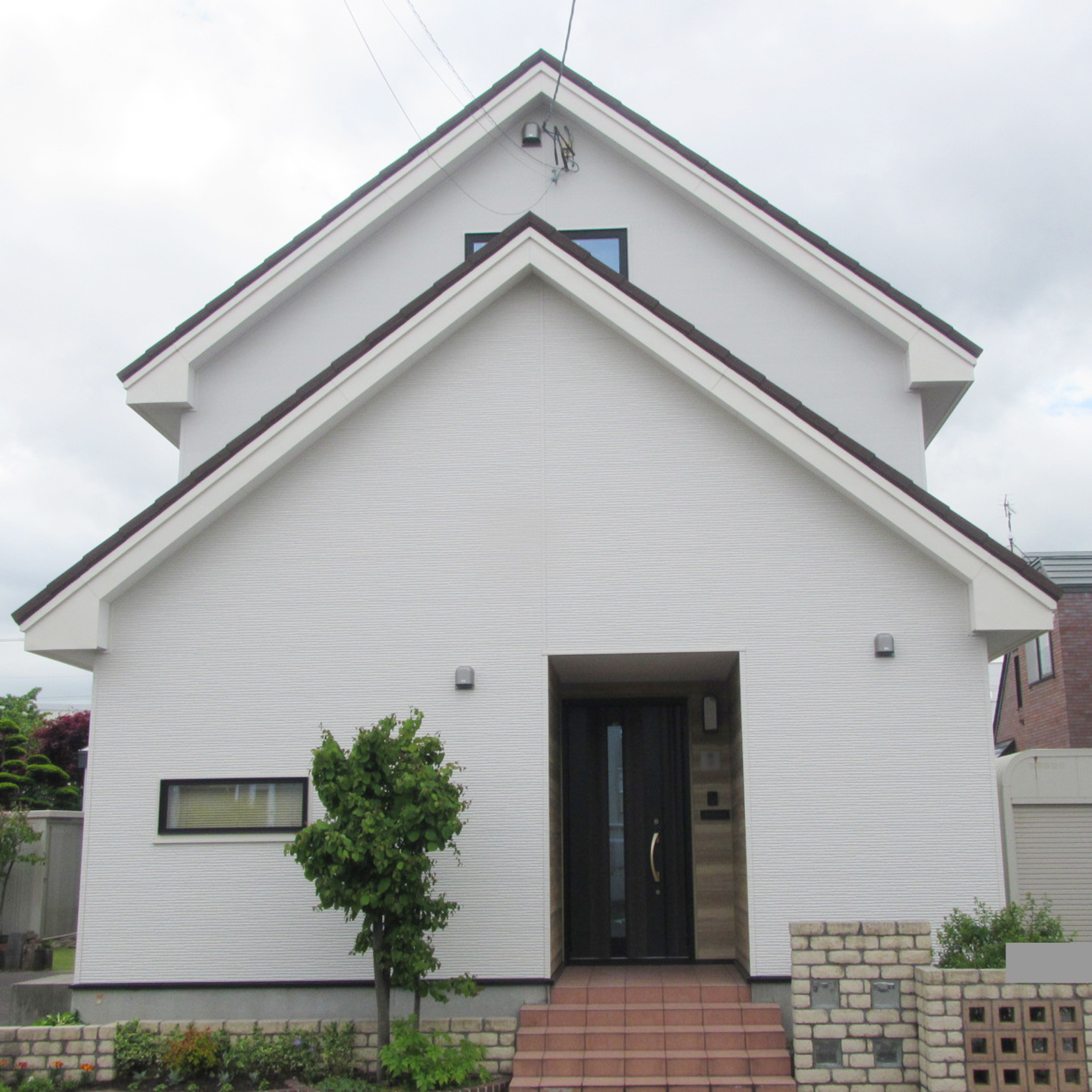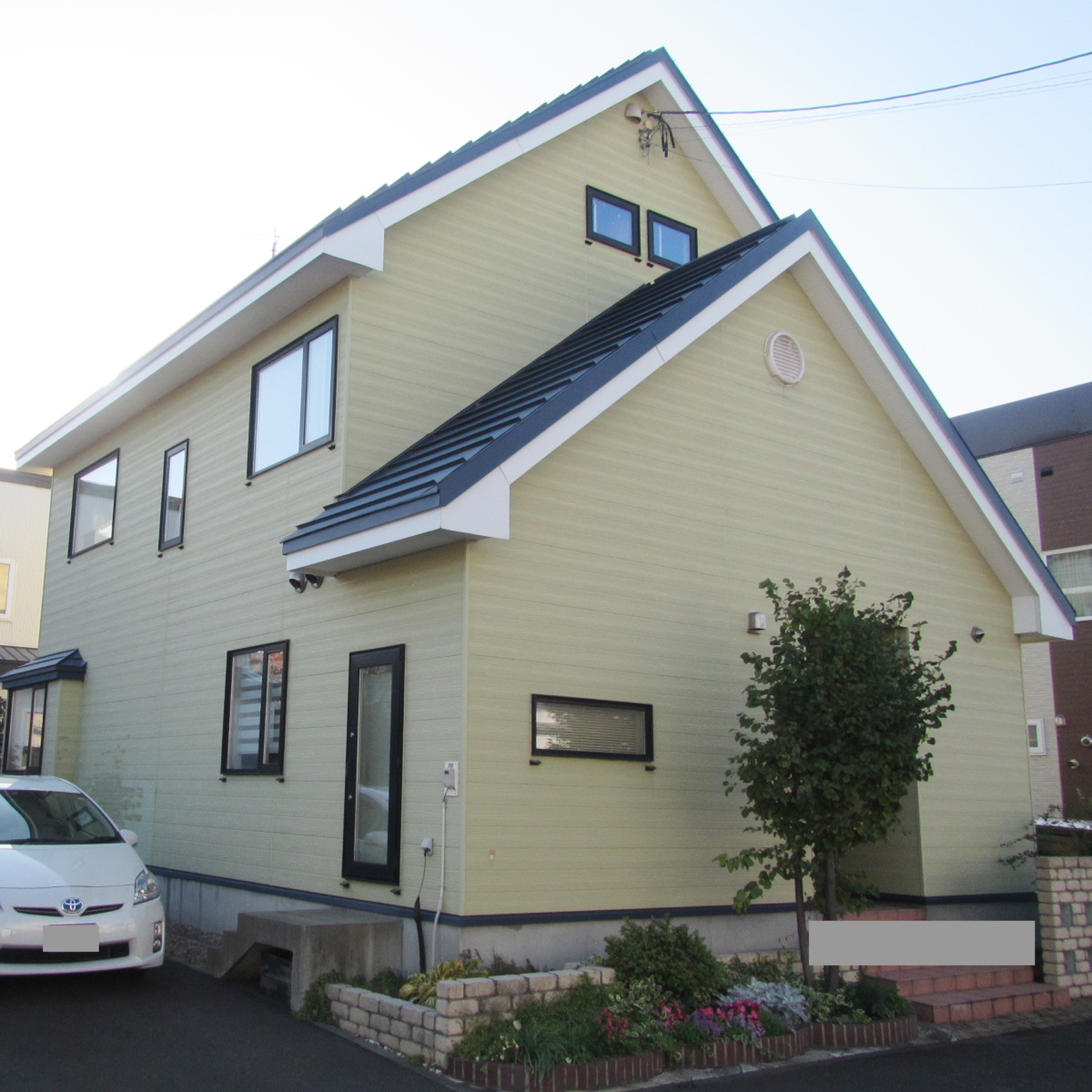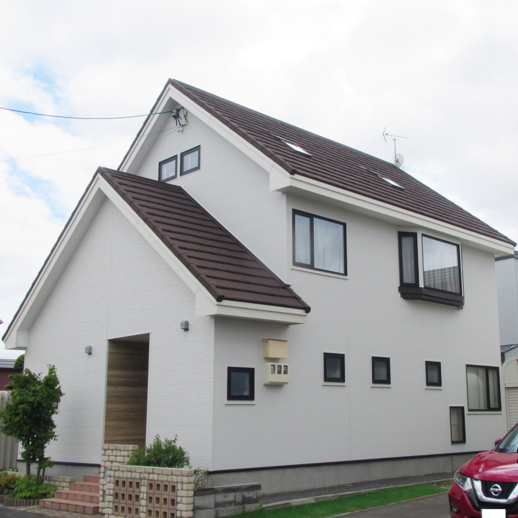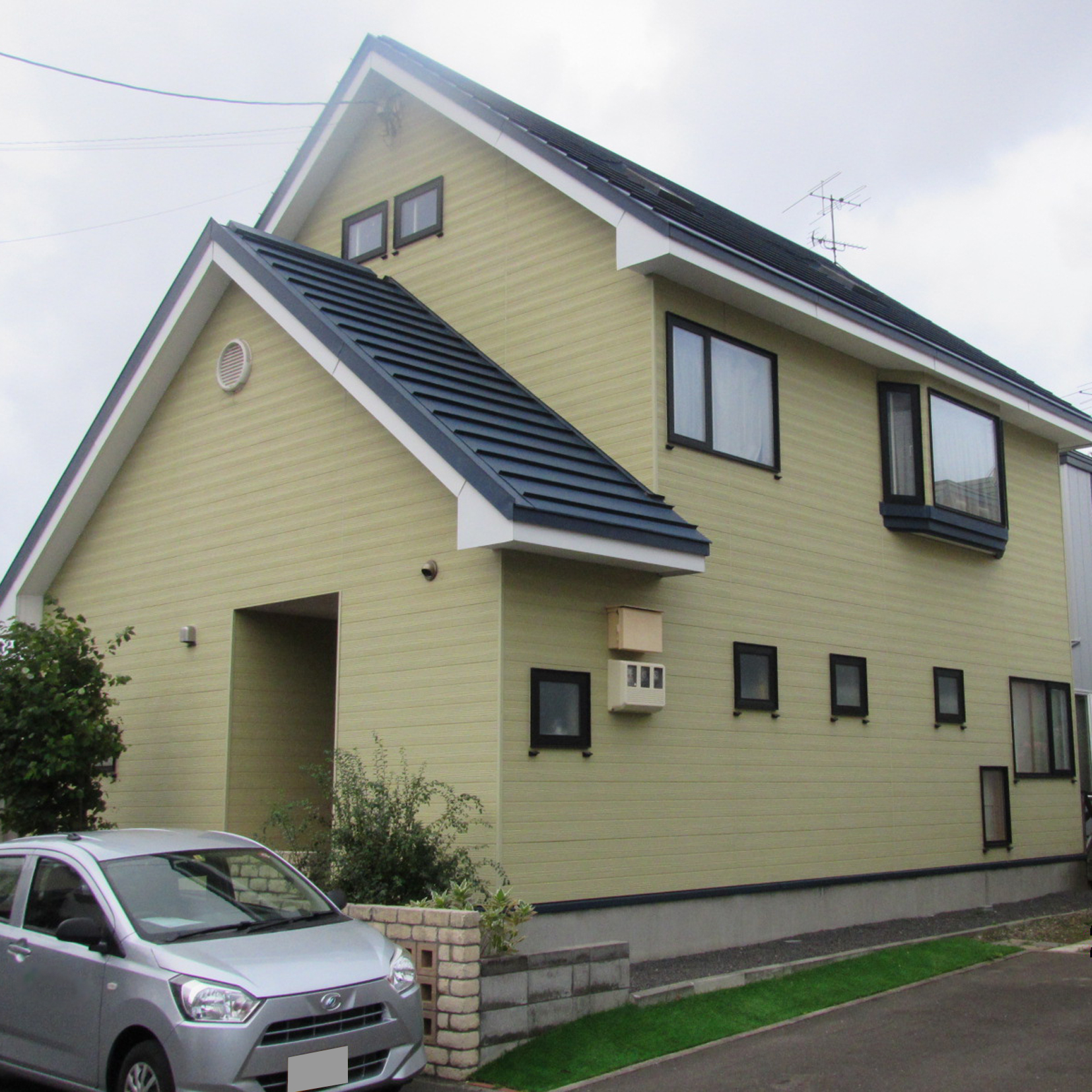 ストッパールーフの勾配屋根のため、雨水の一点集中と冬の大きなつららで外壁が傷んでいてコロナルーフを検討していたお客様。最初は予算を抑えるために雨水が集中する部分に雨樋を取り付けて排水桝に接続する提案をしていましたが、冬期の凍結防止のための電気代や見栄え等も考慮して、屋根全体をお客様も希望していたコロナルーフに葺き替えることにしました。外壁もメンテナンスがしやすい金属サイディングに全面張り替えました。長期優良住宅化リフォーム推進事業の補助金を利用しています。