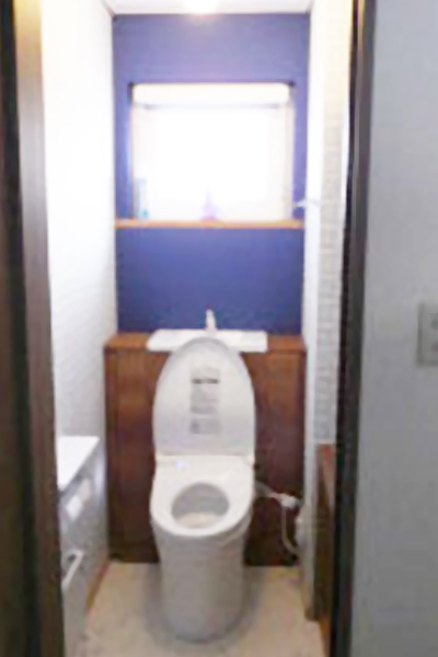 トイレ交換と一緒に内装も一新。正面の壁クロスは色を変えてアクセントにしました。(参考:正面クロス〈サンゲツ〉TWP2540)