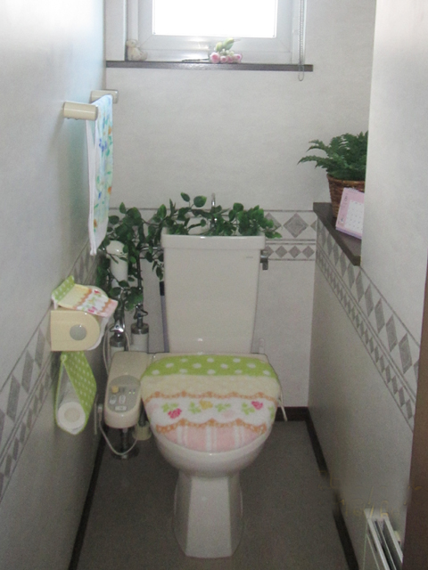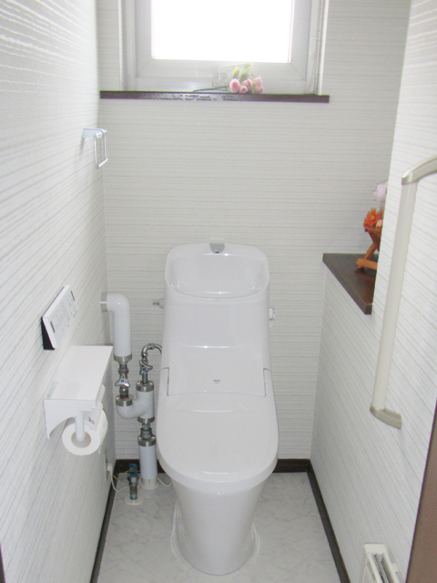 トイレが古くなったので、ウォシュレット一体型の節水トイレに交換しました。ペーパーホルダー・タオルリングも交換し、壁天井のクロス貼替、床クッションフロアの貼替もしています。I型の手すりを取り付けたので将来的にも安心です。また、もともとあった飾り棚の正面にエコカラットを施工しアクセントにしました。エコカラットには調湿・脱臭機能があるのでトイレ空間には有効ですね。